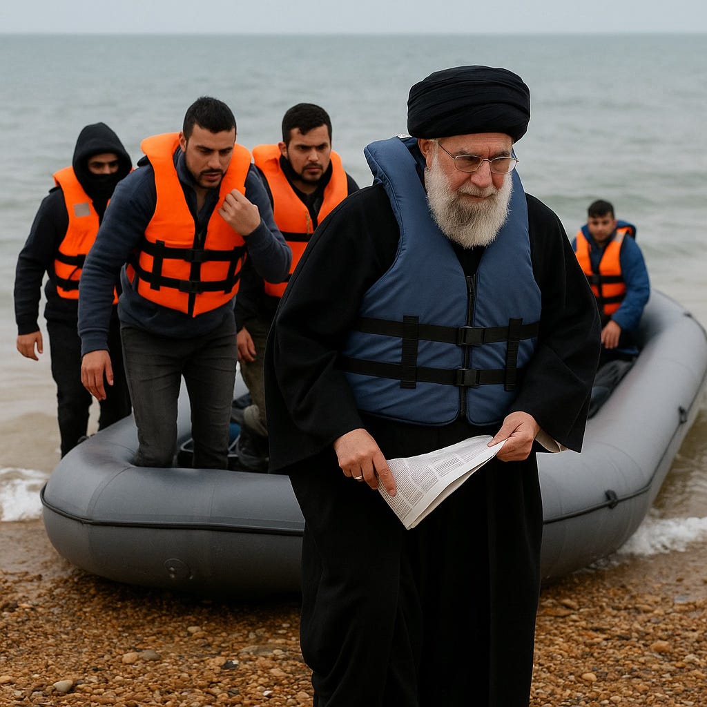 DOVER - In a stunning development following U.S. airstrikes on Iranian nuclear facilities, Iran’s Supreme Leader Ayatollah Ali Khamenei arrived on British shores early this morning via a small inflatable dinghy, reportedly muttering “death to America” in Farsi and surprisingly fluent Cockney rhyming slang.