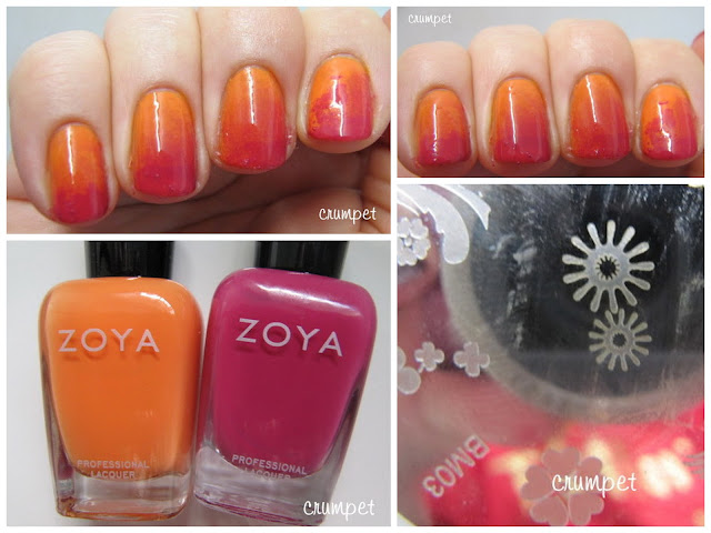For me, Hot Hot Hot mean hot summer colours, and I picked something I'd been wanting to do for a few weeks - an orange to hot pink gradient. The orange is Zoya Arizona (thanks Lyncia) and the pink is one of my most used, Zoya Dawn.