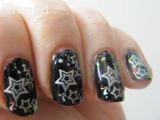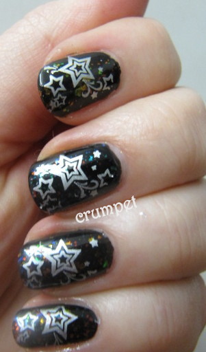 So, for my not boring in any way at all no way Jose stars, we have - 2 coats of OPI Black Onyx and then a mixture of the 3 Picture Polish flakies - Festival, Splendour and Hypnotic. I then used good ole Barry and his M for my stamping - his special effects Silver Foil (stamps like a dreeeeeeeeeam).