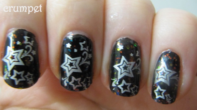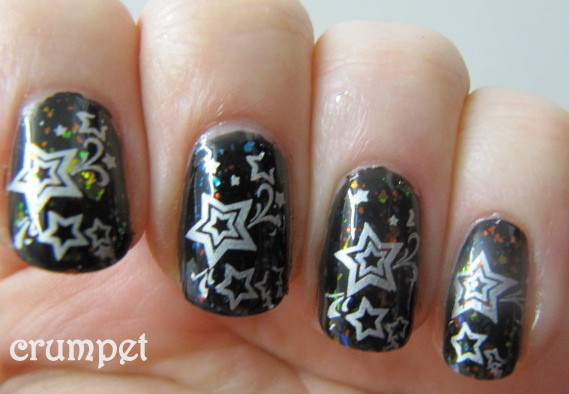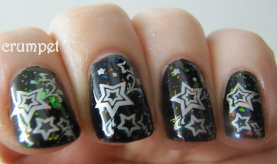 I wasn't sure what I'd do for this one, and imagined inspiration would strike me as soon as I worked out which plate to use - BM21. But no. Twas just stars ..... I didn't want to be too dull, and I thought about doing black stars on white - like a negative, but then, when I was playing around with some other polishes for a series of posts, happenstance struck.