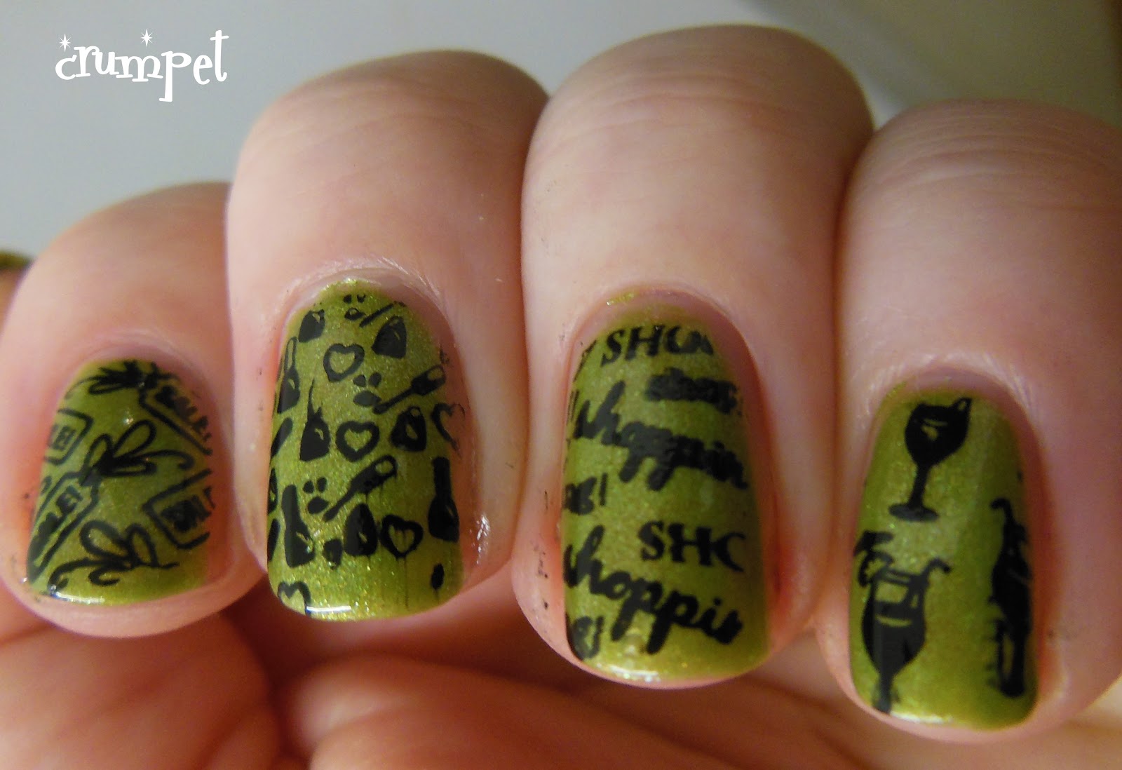 The base is Butter London Dosh, a lovely mushy pea green with hints of gold. I'm going to run you through the stamps 1 by 1 -