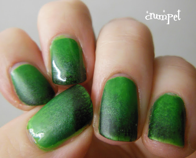 Let's do the mani first. This is a dark green gradient of China Glaze Starboard, ManGlaze Nawsome Sauce and OPI Black Onyx, all over 2 layers of China Glaze GaGa For Green.
