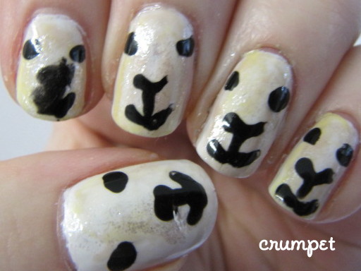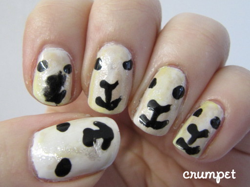 So I decided that for my lambs I would do a backdrop of their fur (? wool?) which always looks dirty, matted and possibly fecal to me. For this I used a base of SH White On, and then swooshed around with Nails Inc Colville Mews, CG Lemon Fizz, CC Incognito and KleanColor Metallic White. And voila, an off-white matted, dirty and possibly fecal mess.